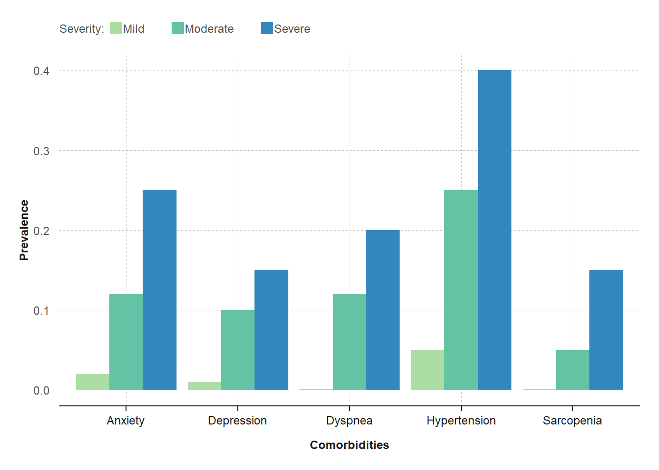 The X-axis displays five comorbidities (anxiety, …, sarcopenia), each categorized by 3 severity levels (mild, moderate, or severe) color coded according to the legend at the top.
