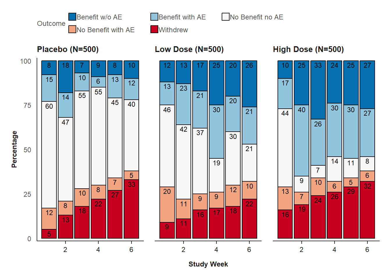 In this hypothetical example, the placebo control group has more subjects with “No Benefit No AE.” The proportion of subjects with benefits is the highest in the high-dose group.